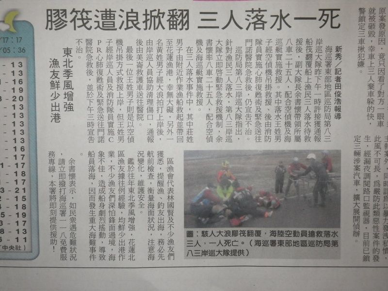 乗り組み員は3人で、二人は病院で入院、一人は亡くなられたようです。おそらく、私が遭遇した心臓マッサージを受けている男性だと思います。原因は波で船が転覆したとのことです。